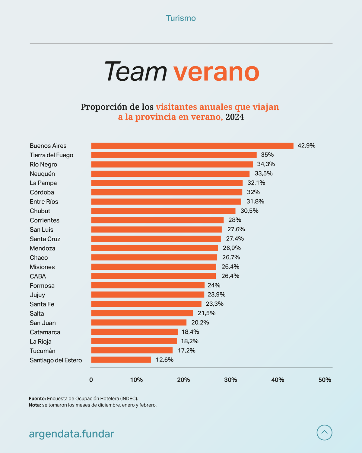 En la Patagonia también se observa una marcada concentración en esos meses. Tierra del Fuego recibe el 35% de su total anual en verano; Río Negro, el 34,3%; y Neuquén, el 33,5%. En estos casos, más de un tercio del movimiento del año se concentra en un único trimestre.