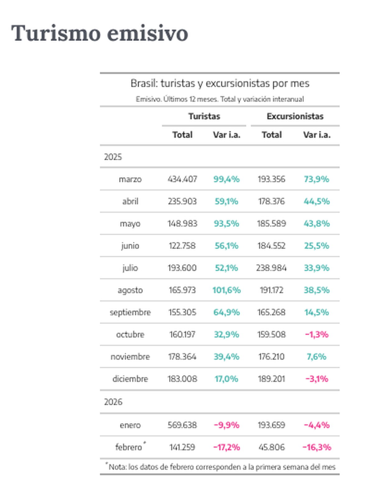Sin embargo, ambos movimientos deben leerse en contexto: la baja en las salidas se compara contra un enero 2025 récord, cuando el emisivo había saltado 73%, mientras que el leve repunte en las llegadas se mide sobre un mes que había caído más de 20%.
