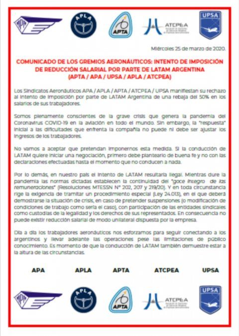 “Los sindicatos aeronáuticos manifiestan su rechazo al intento de imposición por parte de Latam Argentina, de una rebaja del 50% en los salarios de sus trabajadores”, comienza un comunicado conjunto que lleva la firma de APA (personal aeronáutico), APLA (pilotos), UPSA (personal superior), Atcpea (tripulantes de cabina) y APTA (mecánicos). “Somos plenamente conscientes de la grave crisis que genera la pandemia del coronavirus Covid-19 en la aviación en todo el mundo. Sin embargo, la ‘respuesta’ inicial a las dificultades que enfrenta la compañía no puede ni debe ser ajustar los ingresos de los trabajadores”, continúa el texto.