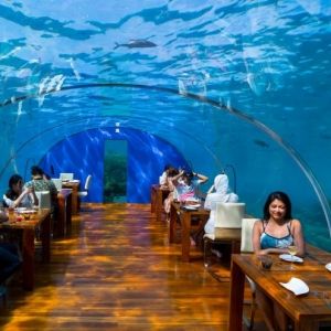 Ithaa, en las Islas Maldivas, está considerado como “el primer restaurante submarino del mundo”. Se trata de un establecimiento recubierto de cristal acrílico y situado a 5 m. bajo el nivel del mar en el Hilton Maldives Resort & Spa Rangali Island, que gracias a su especial estructura ofrece a los comensales una vista de 180° de la vida marina circundante y magníficos corales.