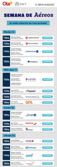 "A sabiendas de que vamos a volver a viajar, los representantes de cada una de las líneas aéreas brindarán información acerca de cómo vamos a hacerlo, cuáles son los protocolos de seguridad que deberán cumplirse y las medidas sanitarias que serán implementadas, de ahora en más, en cada vuelo. ¡Inscribite y enterate de todas las novedades del sector!", mencionaron desde Ola.