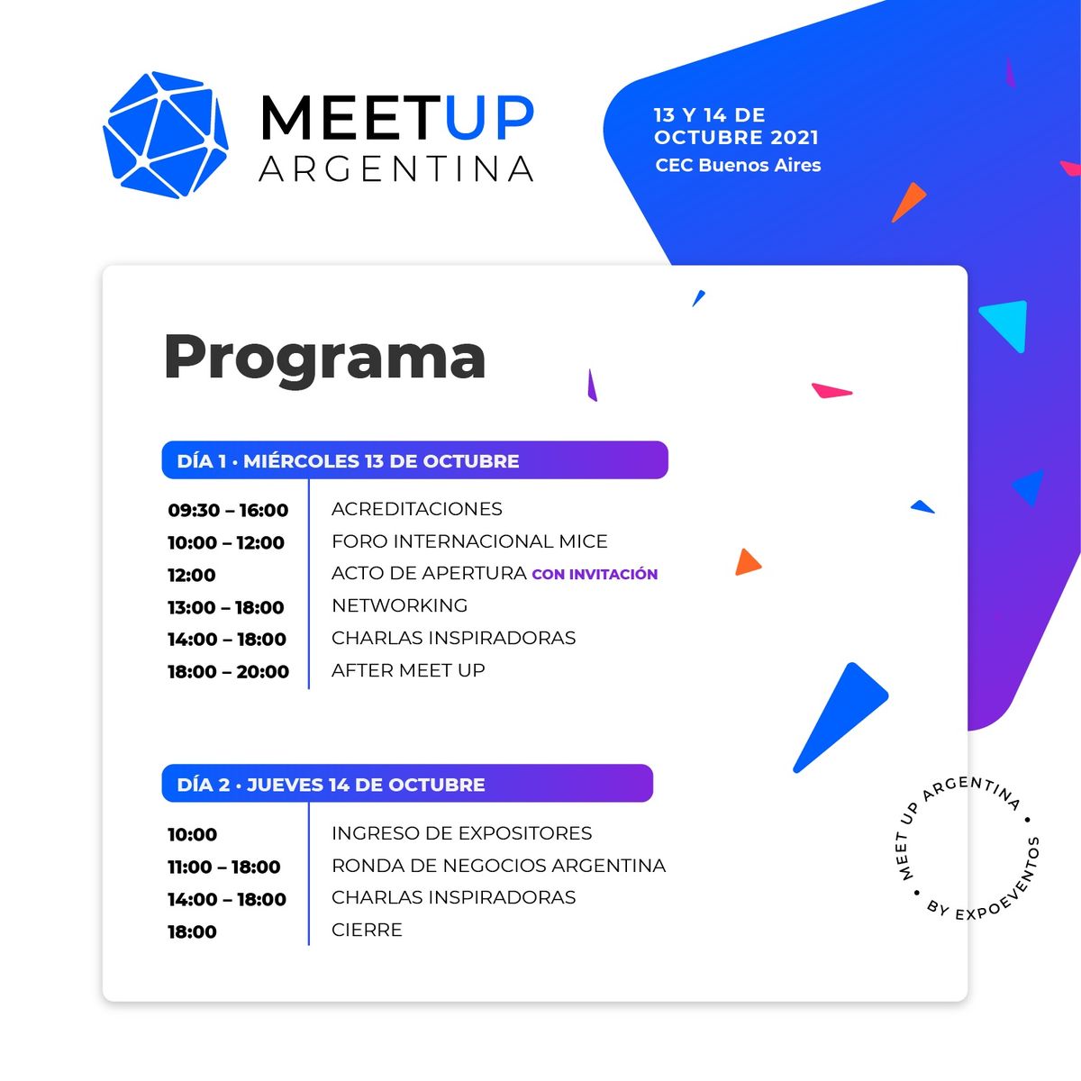 “Meet Up Argentina contará con las características rondas de negocios, espacios especialmente creados para que los participantes formen nuevos vínculos y generen renovadas oportunidades”, sostuvo Fernando Gorbarán, para aclarar: “Sin embargo, y a diferencia de Expoeventos, Meet Up se enfocará en las experiencias como motor de inspiración y en la generación de proyectos para volver a poner de pie a nuestra industria ”.